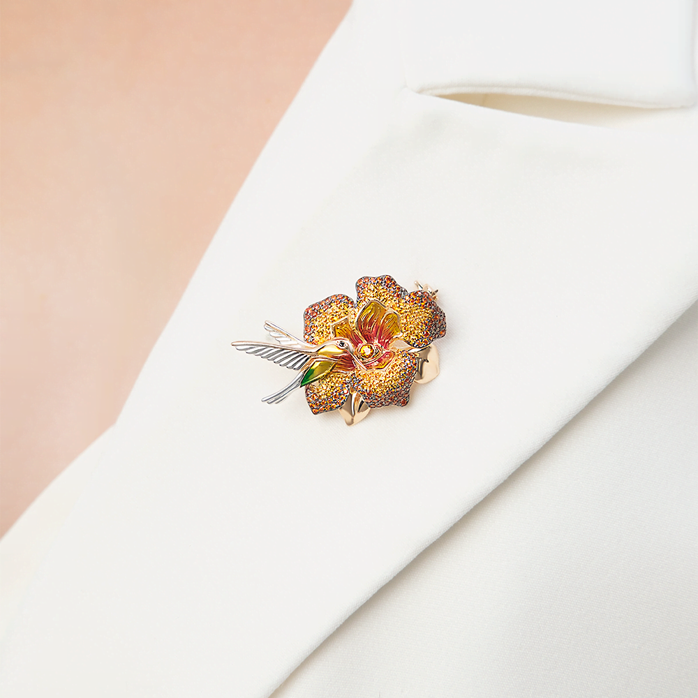 Брошь «Колибри» из красного золота с фианитами и эмалью